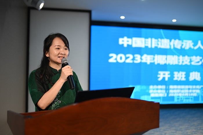 陳虹霓在開班講話中指出,2023年是學(xué)習(xí)貫徹黨的二十大精神開局之年,也是海南自貿(mào)港建設(shè)全島封關(guān)運(yùn)作準(zhǔn)備的關(guān)鍵之年。舉辦此次培訓(xùn)班是貫徹落實(shí)習(xí)近平總書記關(guān)于傳承發(fā)展中華優(yōu)秀傳統(tǒng)文化重要論述、海南省第八次黨代會(huì)精神的具體舉措。非物質(zhì)文化遺產(chǎn)的重要特性是活態(tài)傳承,主要依靠傳承人的口傳心授和言傳身教進(jìn)行傳承。傳承人掌握并承載著非物質(zhì)文化遺產(chǎn)的知識(shí)和精湛技藝,既是非物質(zhì)文化遺產(chǎn)活的寶庫(kù),又是代代相傳的代表性人物。希望傳承人及其弟子珍惜這次走進(jìn)藝術(shù)殿堂的機(jī)會(huì),使自己的理論素養(yǎng)和業(yè)務(wù)能力有所提高,堅(jiān)持學(xué)用結(jié)合,切實(shí)提高椰雕技藝的傳承能力、審美意識(shí)和技藝水平,為做好非遺保護(hù)傳承工作做出新的更大的貢獻(xiàn)。