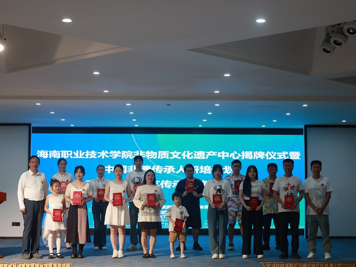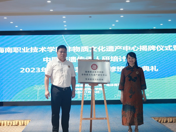 結業(yè)班上,陳虹霓和許昌斌為海南職業(yè)技術學院非物質文化遺產研究中心傳承教育實踐基地揭牌。