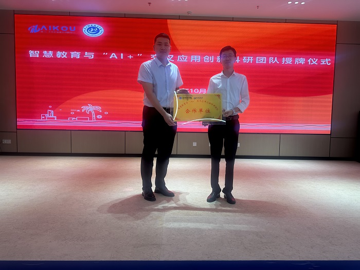 孟清向王建朝授“智慧教育與“AI+”交叉應(yīng)用創(chuàng)新科研團隊合作單位”牌匾(海職院供圖)