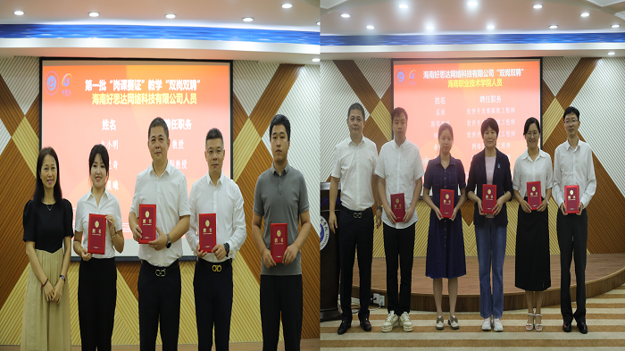簽約儀式后,陳玨與吉小明共同為校企雙方員工和教師頒發(fā)了“雙崗雙聘”證書。經(jīng)校企雙方推薦,海南職業(yè)技術(shù)學(xué)院研究決定,聘請(qǐng)海南好思達(dá)網(wǎng)絡(luò)科技有限公司吉小明等11位同志為第一批人工智能專業(yè)群“崗課賽證”教學(xué)“雙崗雙聘”教師。海南好思達(dá)網(wǎng)絡(luò)科技有限公司研究決定,聘請(qǐng)海南職業(yè)技術(shù)學(xué)院孟清等10位同志為海南好思達(dá)網(wǎng)絡(luò)科技有限公司軟件開發(fā)部與網(wǎng)絡(luò)運(yùn)維部一線工程師,聘期均為5年。