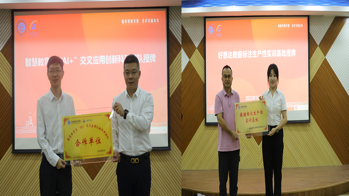 頒證儀式后,校企雙方互授實(shí)訓(xùn)基地牌匾。孟清向李蘭奇頒授“智慧教育與“AI+”交叉應(yīng)用創(chuàng)新科研團(tuán)隊(duì)合作單位”牌匾,王晨曦向林尤偉頒授“好思達(dá)數(shù)據(jù)標(biāo)注生產(chǎn)性實(shí)訓(xùn)基地”牌匾。
