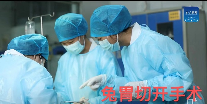 (我校選手認(rèn)真?zhèn)滟?兔胃切開(kāi)手術(shù)環(huán)節(jié) 熱農(nóng)學(xué)院供圖)