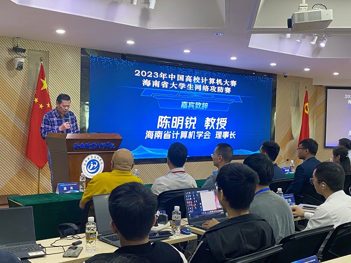 海南省計算機協(xié)會理事長、海南職業(yè)技術學院客座教授陳明銳鼓勵同學們多參加比賽,“一次參賽,終身受益”,他希望各參賽隊伍能夠賽出水平、深化友誼、切磋技藝,為網(wǎng)信事業(yè)發(fā)展貢獻力量。