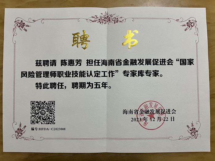 日前,經(jīng)海南省金融發(fā)展促進會擇優(yōu)遴選,我校經(jīng)濟管理學(xué)院陳惠芳、彭帆兩名老師成功入選為“國家風(fēng)險管理師職業(yè)技能認定工作”專家?guī)斓氖着诵某蓡T。同時,陳惠芳和彭帆兩位老師還成為海南省金融發(fā)展促進會的個人會員。