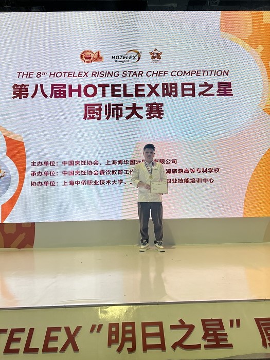 3月27日-29日,由中國烹飪協(xié)會主辦、中國烹飪協(xié)會餐飲教育工作委員會承辦的第八屆“HOTELEX明日之星”廚師大賽在上海舉行。來自全國的60多所院校約500余名選手參加,經(jīng)過激烈角逐,我校烹飪專業(yè)教師廖秀奇憑借扎實的基本功、沉著的臨場發(fā)揮最終榮獲中式藝術(shù)冷拼項目金獎。