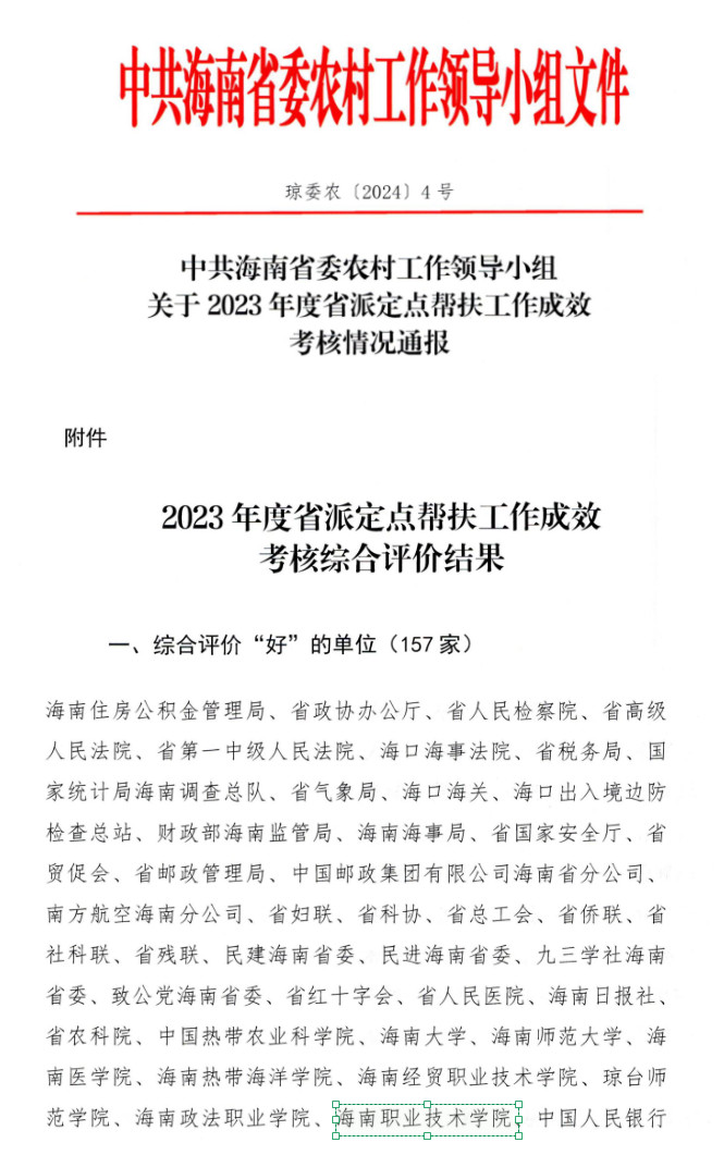 近日,海南省委農(nóng)村工作領(lǐng)導(dǎo)小組印發(fā)《關(guān)于2023年度省派單位定點(diǎn)幫扶工作成效考核情況的通報(bào)》,海南職業(yè)技術(shù)學(xué)院成效考核評(píng)價(jià)等級(jí)為“好”,此榮譽(yù)是省派單位定點(diǎn)幫扶工作成效綜合評(píng)價(jià)的最高等級(jí)。