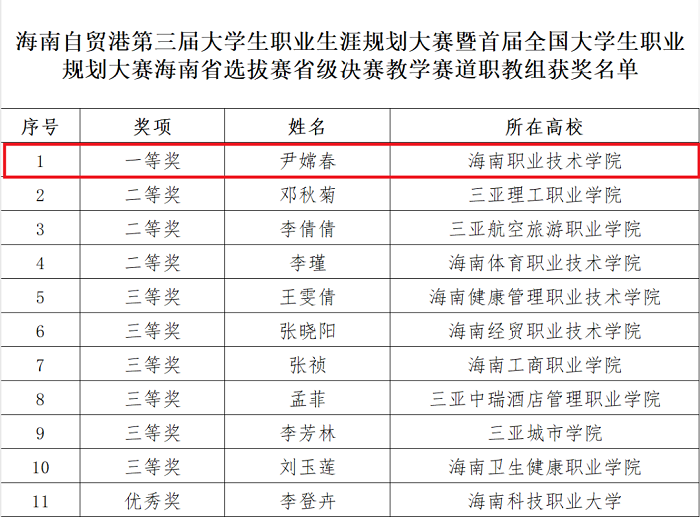近日,海南省人力資源和社會保障廳、海南省教育廳公布了第三屆大學生職業(yè)生涯規(guī)劃大賽暨首屆全國大學生職業(yè)規(guī)劃大賽海南省選拔賽省級決賽比賽結(jié)果,海南職業(yè)技術(shù)學院(以下簡稱“海職院”)參賽師生囊括一等獎1項、三等獎2項、優(yōu)秀獎5項,展現(xiàn)了深厚的職業(yè)規(guī)劃教育實力。其中學生工作處副處長尹嫦春及其課程團隊(高茹、倪嘯旻、姚玉靜、李斯)一舉斬獲教師賽道高職組第一名的好成績并代表海南省入圍全國總決賽現(xiàn)場賽。(具體獲獎名單詳見下圖)
