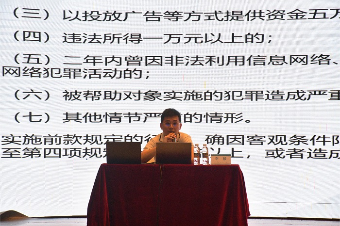 李律師用深厚的專業(yè)功底和多年的從業(yè)經(jīng)歷,分別從法律規(guī)定、入罪標準和實際案例三個角度,向同學們詳細解讀了幫信罪、掩隱罪和電信詐騙罪,并結合青年群體高發(fā)犯罪類型的特點,向同學們普及了故意傷害罪、尋釁滋事罪等知識。最后,李律師呼吁同學們要嚴格守法,樹立正確的財富觀,增強辨別是非和自我保護的能力,堅持“君子愛財 取之有道”,自覺踐行社會主義核心價值觀,做到學法、知法、守法、用法。