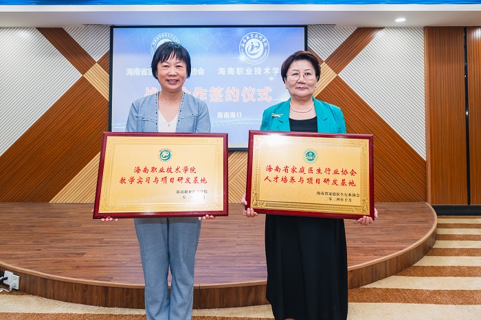 為全面深化學(xué)校與協(xié)會(huì)在醫(yī)療健康服務(wù)領(lǐng)域的合作,推動(dòng)海南醫(yī)療健康事業(yè)與高等教育的融合發(fā)展,培養(yǎng)更多適應(yīng)社會(huì)需求的高素質(zhì)專業(yè)人才,海南省家庭醫(yī)生行業(yè)協(xié)會(huì)與海南職業(yè)技術(shù)學(xué)院達(dá)成戰(zhàn)略合作關(guān)系。宋曼萍與李琳娜分別代表雙方在現(xiàn)場簽署合作協(xié)議并互授牌匾。