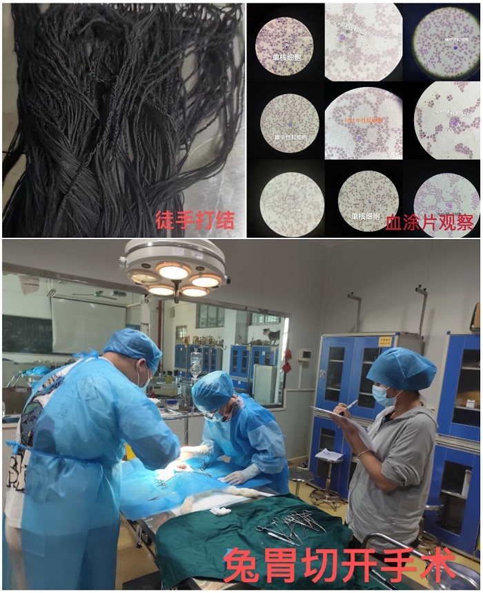 本次比賽公分為理論知識考試、理論知識搶答和實操技能比拼三個環(huán)節(jié)。賽前,全體參賽同學完整梳理各類知識點,克服知識量大、知識點多的困難。同時,在指導教師的悉心指導下,大量和反復練習徒手打結、血涂片制作、兔胃切開手術等實操項目。在比賽中,我校參賽同學都以飽滿的熱情投入到比賽之中,他們沉著冷靜、團結奮戰(zhàn),展示了扎實的理論知識儲備和高超的實操技術水平。