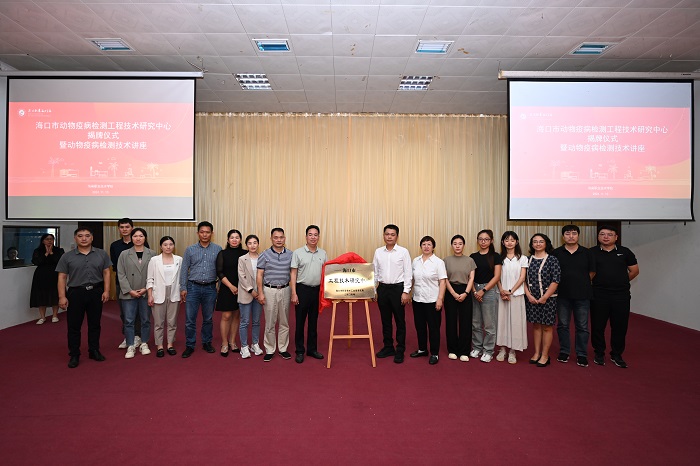 揭牌儀式上,校黨委委員、副校長符興干代表學校發(fā)表致辭。他指出中心的成立對于推動動物疫病防控科技進步、服務(wù)社會的重要性,并對未來的發(fā)展方向和目標進行了展望。我校熱帶農(nóng)業(yè)技術(shù)學院王云惠院長表示,中心將邀請省內(nèi)外高校、科研院所及行業(yè)專家、教授,共同組建研發(fā)團隊,致力于動物疫病檢測技術(shù)創(chuàng)新、人才培養(yǎng)和服務(wù)平臺建設(shè),為海南自貿(mào)港動物疫病檢測領(lǐng)域的發(fā)展貢獻力量。