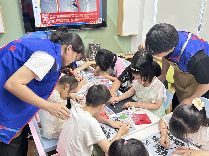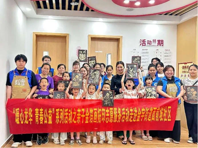 在“金箔流光繪傳承”的實(shí)踐創(chuàng)作環(huán)節(jié),志愿者和孩子們一起細(xì)心拆解金箔畫制作流程,從“畫”“涂”“貼”“掃”四個(gè)關(guān)鍵步驟入手,向孩子們講解每個(gè)環(huán)節(jié)的操作要點(diǎn)和示范,孩子們迫不及待地拿起工具,與家長(zhǎng)攜手開啟創(chuàng)意手工之旅?;顒?dòng)現(xiàn)場(chǎng)氣氛熱烈,孩子們專注創(chuàng)作的身影與家長(zhǎng)悉心指導(dǎo)的溫馨畫面,構(gòu)成生動(dòng)的非遺傳承圖景。