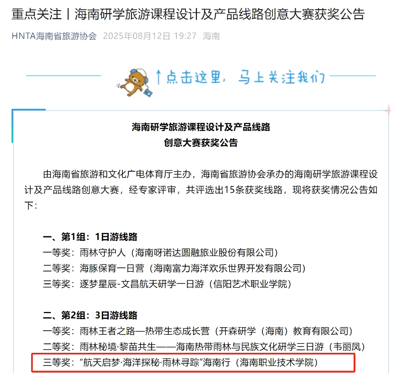 近日,海南省旅游和文化廣電體育廳正式公布“海南研學旅游課程設計及產品線路創(chuàng)意大賽”獲獎名單。我校旅游學院任靈、陳文妍兩位教師的參賽作品在眾多優(yōu)秀方案中脫穎而出,榮獲大賽三等獎。