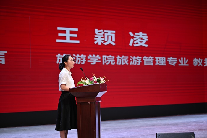 旅游學(xué)院旅游管理專業(yè)教師王穎凌代表新入職的教師發(fā)言表示,將以優(yōu)秀教師為榜樣,學(xué)習(xí)他們愛崗敬業(yè)、無私奉獻(xiàn)的精神和他們關(guān)愛學(xué)生、以生為本的師者情懷。將認(rèn)真鉆研業(yè)務(wù),不斷提升教育教學(xué)水平,用實際行動踐行“躬耕教壇”的初心,將所有的熱忱與智慧奉獻(xiàn)給崇高的教育事業(yè),將所有的努力與奮斗濃縮于“強校不必在我,興校必定有我”的責(zé)任與擔(dān)當(dāng)。