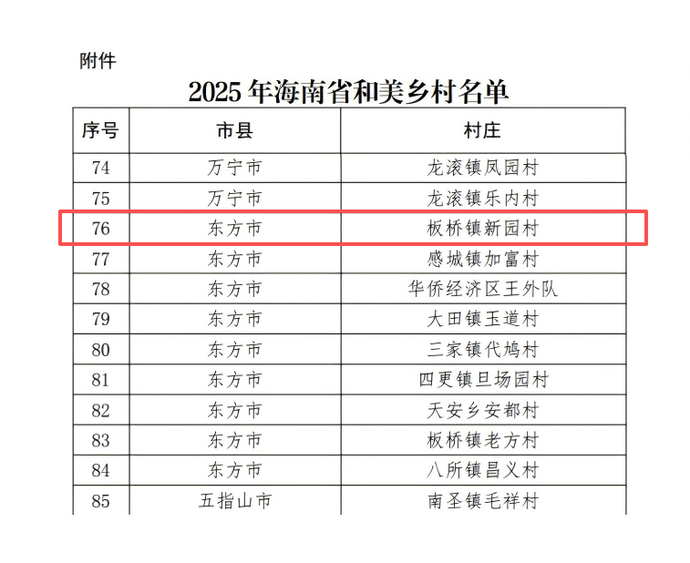 近日,海南省農(nóng)業(yè)農(nóng)村廳正式公布2025年海南省和美鄉(xiāng)村名單,全省共200個(gè)行政村(社區(qū)、居)獲此殊榮。其中,由我校鄉(xiāng)村振興定點(diǎn)幫扶對(duì)象—東方市板橋鎮(zhèn)新園村成功入選,標(biāo)志著該村在宜居宜業(yè)、鄉(xiāng)風(fēng)文明、治理有效等方面取得顯著成效,也彰顯了校地協(xié)同推進(jìn)鄉(xiāng)村振興的實(shí)踐成果。