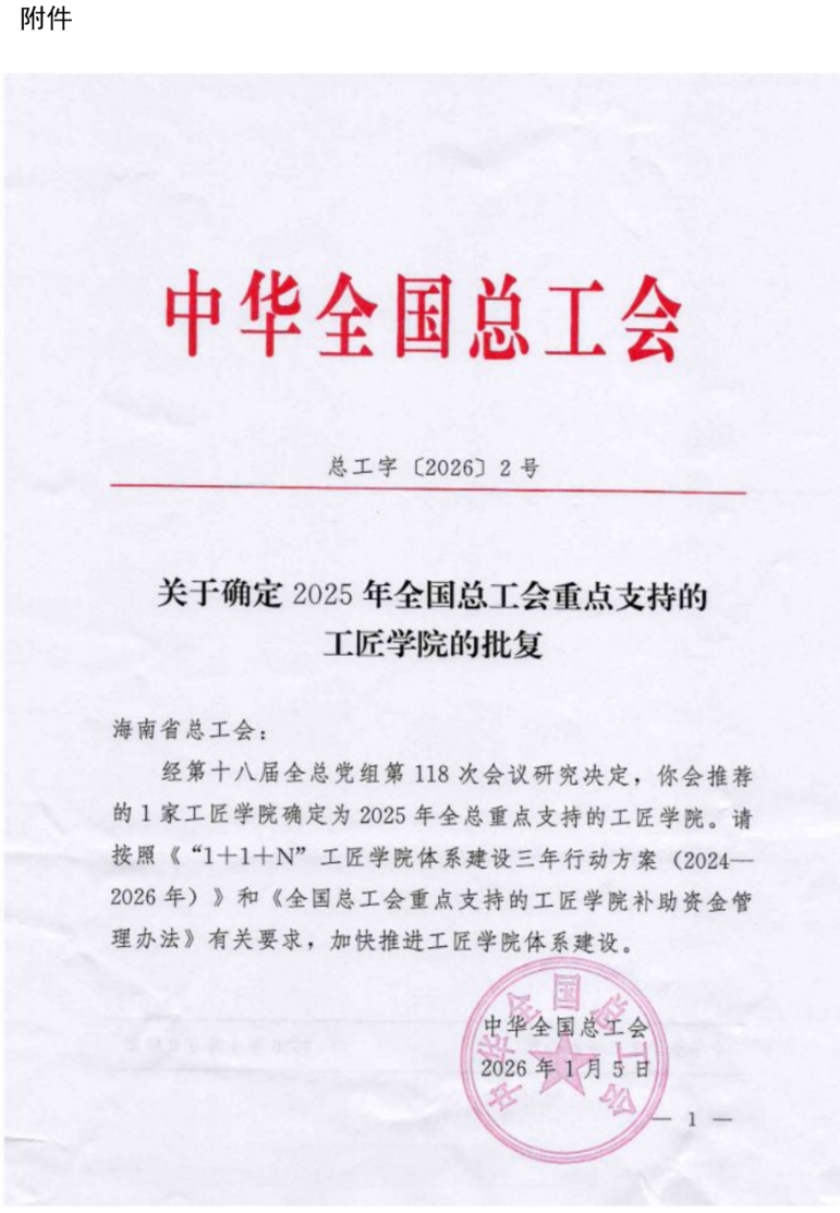 近日,中華全國(guó)總工會(huì)印發(fā)《關(guān)于確定2025年全國(guó)總工會(huì)重點(diǎn)支持的工匠學(xué)院的批復(fù)》,我校被確定為2025年中華全國(guó)總工會(huì)重點(diǎn)支持的工匠學(xué)院,此次入選標(biāo)志著學(xué)校在深化產(chǎn)教融合、培養(yǎng)高素質(zhì)技能人才方面的實(shí)踐與成果獲得了國(guó)家級(jí)認(rèn)可。