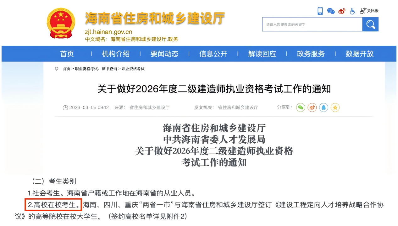 近日,海南省住房和城鄉(xiāng)建設廳聯(lián)合中共海南省委人才發(fā)展局正式發(fā)布《關于做好2026年度二級建造師執(zhí)業(yè)資格考試工作的通知》。其中最引人注目的變化是首次允許高校在校學生報名參加考試。作為與海南省住建廳簽訂《建設工程定向人才培養(yǎng)戰(zhàn)略合作協(xié)議》的高校之一,海職院建筑工程技術(shù)、工程造價、道路與橋梁工程技術(shù)專業(yè)的在校學生將享受這一政策紅利,憑教育部學籍在線驗證報告即可報考二級建造師,無需提供畢業(yè)證書和工作經(jīng)歷證明。這一政策打破了傳統(tǒng)“從事建設工程項目施工管理工作滿2年”的報考限制,真正實現(xiàn)了執(zhí)業(yè)資格認證的前置化,為在校學生打通了“在??荚嚒厴I(yè)轉(zhuǎn)正、來瓊即用”的人才培養(yǎng)新通道。