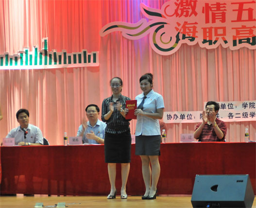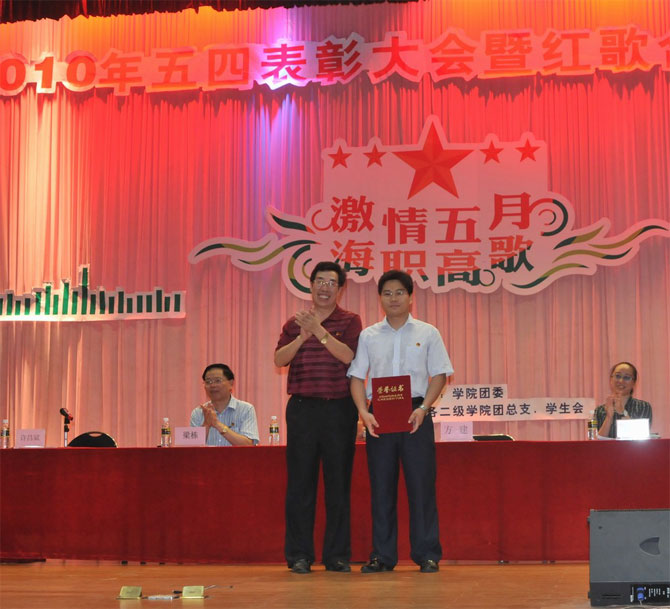 團(tuán)委袁媛書記宣讀了共青團(tuán)海南省委(瓊團(tuán)字【20106號文件)《關(guān)于表彰2009年度“海南省五四紅旗團(tuán)委”、“海南省五四紅旗團(tuán)總支”、“海南省優(yōu)秀共青團(tuán)員”和“海南省優(yōu)秀共青團(tuán)干部”的決定》、共青團(tuán)??谑形êF(tuán)字【201048號文件)《關(guān)于表彰2008-2009年度??谑邢冗M(jìn)青年集體和個人的決定》、海職院團(tuán)委(海職院團(tuán)【20104號)《關(guān)于表彰五四紅旗團(tuán)總支、五四紅旗團(tuán)支部、優(yōu)秀社團(tuán)、優(yōu)秀團(tuán)干部和青年志愿者標(biāo)兵的決定》;我院旅游與藝術(shù)學(xué)院獲得2009-2010學(xué)年度“海南省五四紅旗團(tuán)總支”榮譽(yù)稱號,團(tuán)委許昌斌老師獲得2009-2010學(xué)年度“海南省優(yōu)秀共青團(tuán)干部”榮譽(yù)稱號,經(jīng)濟(jì)管理學(xué)院陳憶同學(xué)獲得2009-2010學(xué)年度“海南省優(yōu)秀共青團(tuán)員”榮譽(yù)稱號;同時, 9個社團(tuán)被評為學(xué)院“優(yōu)秀社團(tuán)”,28個團(tuán)支部被評為學(xué)院“五四紅旗團(tuán)支部”,165名團(tuán)干部被評為學(xué)院“優(yōu)秀團(tuán)干”、 395名團(tuán)員被評為學(xué)院“優(yōu)秀團(tuán)員”、223名志愿者被評為學(xué)院“青年志愿者標(biāo)兵”,經(jīng)濟(jì)管理學(xué)院團(tuán)總支、生物工程學(xué)院團(tuán)總支被評為學(xué)院“五四紅旗團(tuán)總支”。海南省優(yōu)秀共青團(tuán)員陳憶同學(xué)代表受表彰廣大共青團(tuán)員進(jìn)行了獲獎發(fā)言。