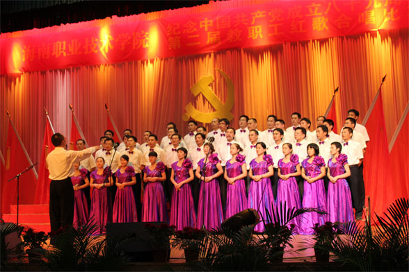 隨后舉行的是第二屆教職工紅歌合唱比賽。本屆紅歌大賽希望用整齊嘹亮的歌聲來慶祝黨的生日,贊美我們偉大的祖國,進一步激發(fā)學院教職員工熱愛祖國、熱愛共產(chǎn)黨、熱愛社會主義的激情,進一步激發(fā)起為建設國際旅游島和建設示范院校拼搏奉獻的精神。